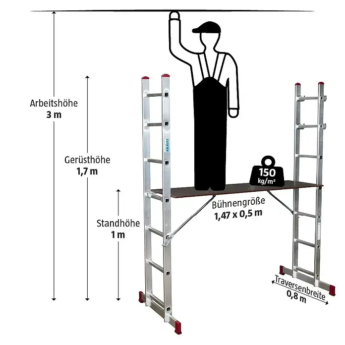 - maximale Arbeitshöhe als Stehleiter: 3m